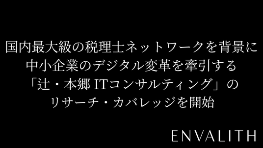 次世代型の株式リサーチ・プラットフォームを展開する株式会社エンヴァリス(本社:東京都渋谷区、代表取締役社長:河井 浩一、以下「当社」)は、辻・本郷ITコンサルティング株式会社(本社:東京都渋谷区、代表取締役社長 黒仁田 健、証券コード:476A、以下「辻・本郷ITコンサルティング」)のリサーチ・カバレッジを開始することをお知らせいたします。