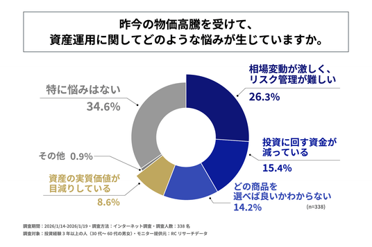 昨今の物価高騰を受けて生じている資産運用に関する主な悩みは、「相場変動が激しくリスク管理が難しいこと」や「投資に回す資金が減っていること」