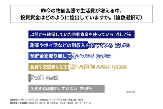 投資経験3年以上の人の約4割が、物価高騰で生活費が増える中での投資資金の捻出方法として「以前から確保していた余剰資金を使用している」
