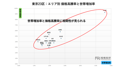 一般的な需給関係の理論に基づけば、横軸に示される世帯増加率が高いエリアほど、マンション購入者数が増加し、取引が活性化することで価格の上昇率も高くなると考えられます。すなわち、本来であれば両者は正比例的な関係を示し、グラフ上のプロットは右上がりに分布するはずです。