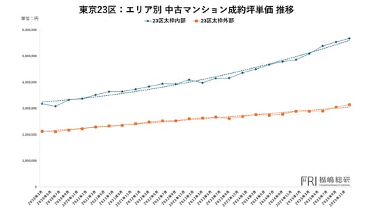 もっとも、これら太枠外エリアにおける成約坪単価の上昇推移を見ると、旧耐震物件の成約割合が増加しているという兆候は確認されるものの、価格が本格的な調整局面に入ったと判断するには時期尚早であると考えられます。むしろ、価格上昇の勢い自体は依然として維持されており、市場全体としてはまだ過熱感を残した状態にあると言えるでしょう。