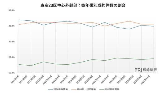 この背景には、前述した供給構造の違いが大きく影響しています。太枠外エリアでは大規模開発による新築供給が限定的である一方、実需マンション価格の高騰により、購入者が相対的に価格水準の低い築年帯へと需要をシフトさせる動きが顕在化しています。すなわち、「築浅が買えない層」が市場に残る在庫の中から現実的な選択肢を模索した結果、築20年以上の物件や旧耐震物件に対する需要が高まっていると考えられます。