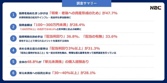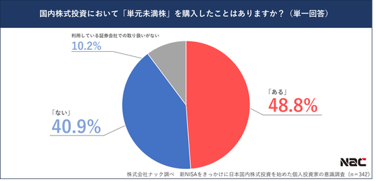 新NISAをきっかけに国内株式投資を始めた個人投資家の約半数となる48.8%が「単元未満株」を購入したことがあるという結果になりました。