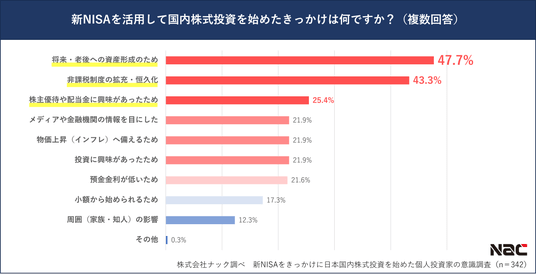 新NISAを活用して国内株式投資を始めたきっかけについて、「将来・老後への資産形成のため」と答えた人は47.7%となり、全体の約5割を占めました。次いで「非課税制度の恒久化」(43.3%)が続き、新NISAの制度改正そのものが投資を促進していることが分かります。