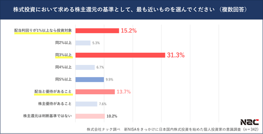 今回の調査結果から、新NISAをきっかけに国内株式投資を始めた個人投資家は、「将来の資産形成」を目的に、配当や株主優待などの安定的なリターンを重視しつつ、単元未満株を活用した分散投資を積極的に取り入れている実態が明らかになりました。また、期待する還元基準では「配当利回り3%以上」が31.3%で最多となったほか、多くの個人投資家が一定の還元基準を持って銘柄選定を行っていることが分かりました。配当・優待という株式を保有することで得られるメリットを軸に、単元未満株も活用して分散と積み上げを図るという投資姿勢がうかがえる結果となり、新NISA制度の普及とともに、今後も国内株式市場における個人投資家の裾野拡大が期待されます。