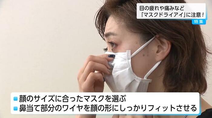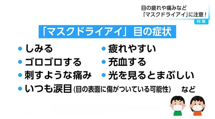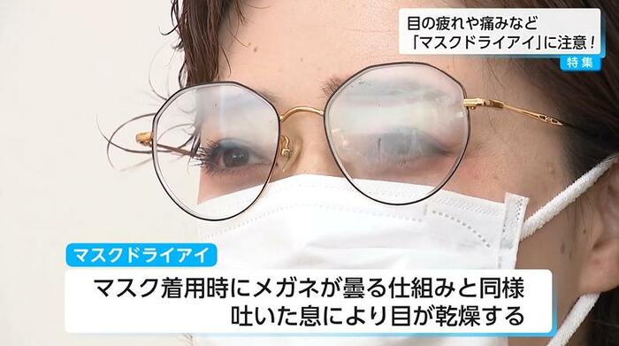 眼鏡をかけた状態でマスクをするとレンズが曇る現象と同様に、マスクの隙間から吐いた息が目に流れ込み、目の乾燥を引き起こすという。