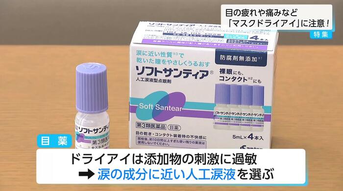 ドライアイの症状がある場合、添加物の刺激に過敏になっていることもあるため、人工涙液(涙に近い成分の目薬)を選ぶと良いという。