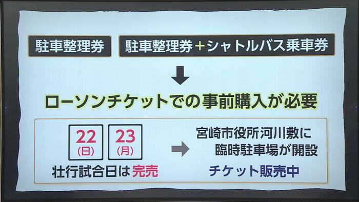 いずれもローソンチケットでの事前購入が必要で、壮行試合のある22日と23日は完売した。宮崎市役所の河川敷にも臨時駐車場が開設され、チケットが販売されている。