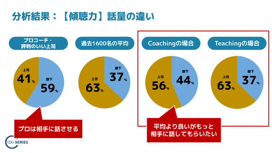 【図の見方】上司/部下の話量比率を、「プロコーチ・評判の良い上司」「過去1600名の平均値」「本調査(コーチング意識時)」「本調査(ティーチング意識時)」で比較しています。