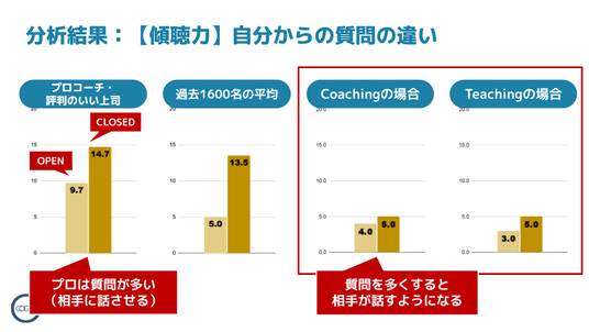 - 思考を広げる質問数が一般企業平均と比較して”半減”、「ティーチング」傾向が明確に -