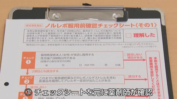 購入希望者は性行為の日時や持病の有無などをチェックシートに記入し、薬剤師が服用可能かを判断する。問題がなければその場で薬を服用するのがルールとなっている。また、服用から3週間後には妊娠検査薬や医療機関受診による妊娠の有無確認が必要だ。