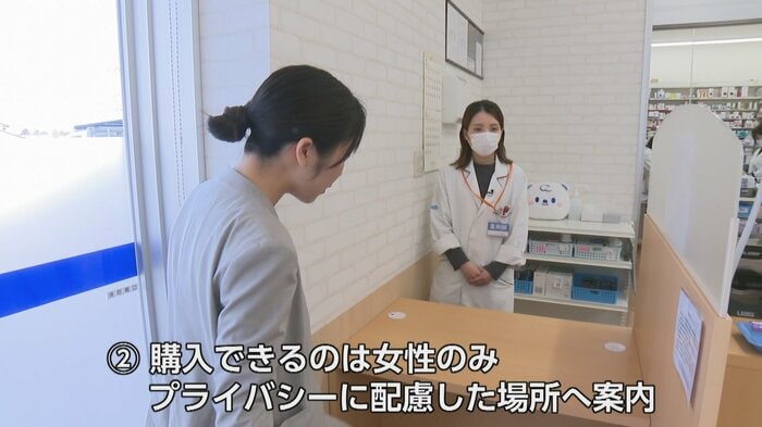 緊急避妊薬は店頭には並んでおらず、購入には薬剤師に直接意思を伝える必要がある。伝えづらい場合はスマートフォンの画面を見せることでも対応可能だ。購入できるのは女性のみで、パーティションで仕切られたプライバシーに配慮した空間に案内される。