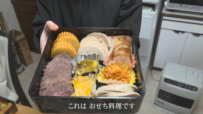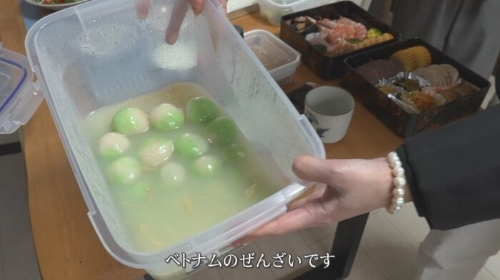 おせち料理を用意する布村さんとチさんたち。チさんは「ベトナムのぜんざいです」とベトナム料理も紹介してくれた。同じベトナム出身の友人・フォンさんも一緒に新年を祝った。