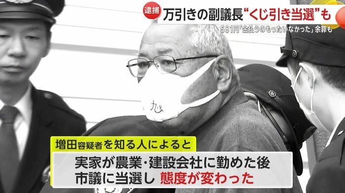 増田容疑者は前回の市議選で定数18のうち18番目となり、もう1人の候補と得票数で並び、くじ引きで当選。2025年12月には、月額36万円の報酬を受け取れる副議長に選ばれていた。