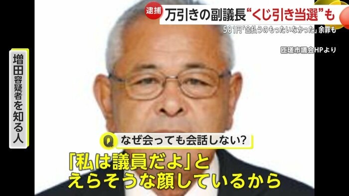 増田容疑者を知る人は「会っても会話してない。(Q.なぜ会っても会話しない?)議員のくせに高ぶって、『私は議員だよ』と偉そうな顔しているから」「金に困っているわけないよ。おれらと違って…」と話した。
