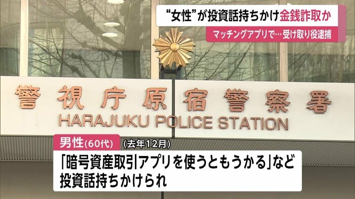 警視庁によると男性は、2025年12月にマッチングアプリで女性を名乗る人物と知り合い「暗号資産取引アプリを使うと儲かる」などの投資話を持ちかけられ、現金を別の受け子に手渡すなどして、合わせて3815万円をだまし取られた。
