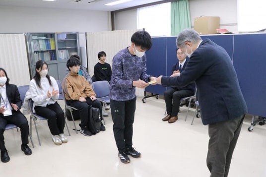 表彰式では、岩崎良章保健管理部門長(学術研究院教育研究マネジメント領域・教授)から表彰状が、後援・協賛の加藤弘樹岡山大学生活協同組合専務理事から賞品が授与されました。
