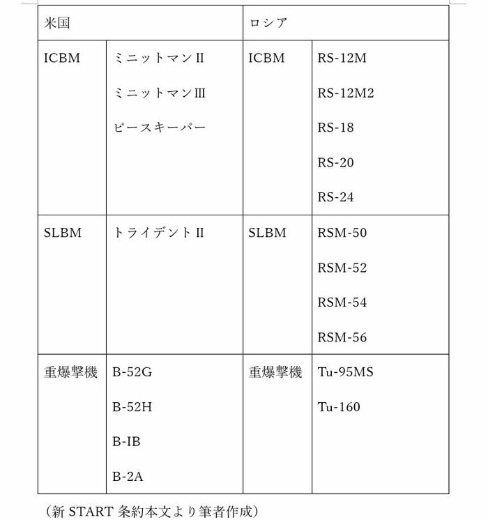 新START条約で、米露両国が署名(2010年4月)した時点で対象となっていた戦略兵器は、以下の表のとおりであり、前述のSALT2条約の対象となっていた戦略兵器と比べると、古い兵器が減り、SALT2以降に登場した新兵器が条約の対象として加わったことがわかる。