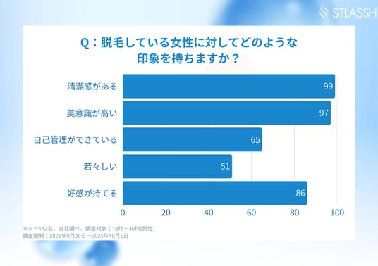 株式会社クリア(本社:東京都渋谷区、代表取締役社長:勝沼 潤)が運営する女性脱毛サロンストラッシュは、10代~40代の男性112名を対象に「『女性の脱毛』に関するアンケート調査」を実施。その結果、約99.1%*¹の男性が『女性の脱毛』に好意的であることが分かりました。