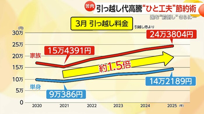 2021年と2025年を比べると、物価高の影響で「家族」の引っ越し料金は15万4391円から24万3804円に、「単身」は9万386円から14万2189円と、共に1.5倍以上になっている。