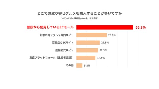 ・お取り寄せグルメを購入する場所1位は「普段から使用しているECモール」で55.3%。