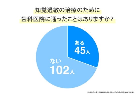 知覚過敏の症状が出たことがある147人に「知覚過敏の治療のために歯科医院に通ったことはありますか?」と尋ねたところ、「ある」が45人、「ない」が102人でした。