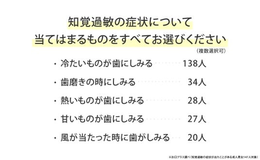 - 知覚過敏の症状経験者は、200人中147人(73.50%)。- 症状は「冷たいものが歯にしみる」が138人(93.88%)で最多(複数選択可)。