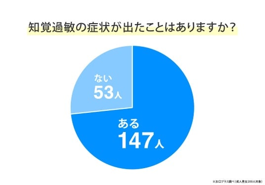 成人男女200人に「知覚過敏の症状が出たことはありますか?」と尋ねたところ、「ある」が147人、「ない」が53人となりました。
