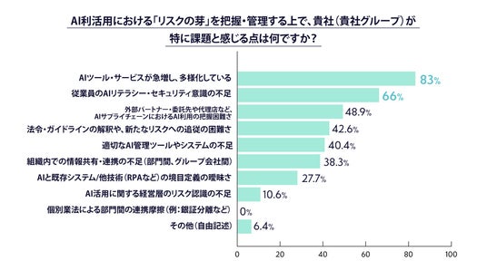 ・「リスクの芽」を捉える上での課題として、「AIツール・サービスの急増と多様化」を83%の企業が、「従業員のAIリテラシー不足」66%の企業が挙げた