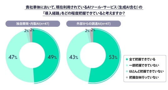 ・独自開発・内製AIおよび外部から調達したAIでは、約半数(49%・53%)の企業が「全て把握できている」と回答