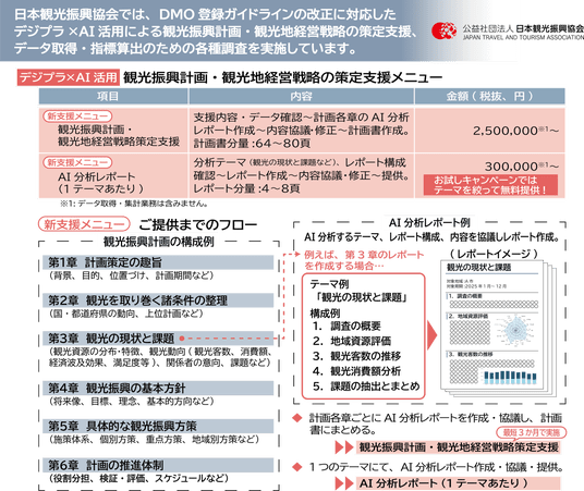 公益社団法人日本観光振興協会(本部:東京都港区 会長 菰田正信・三井不動産株式会社代表取締役会長)は、日本最大級の観光データ・マーケティングデータを搭載した「日本観光振興デジタルプラットフォーム(通称、デジプラ※)」において、60年以上培った観光振興計画策定のノウハウとAIのデータ分析を組み合わせた新支援メニューの提供を開始します。