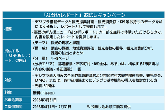 新支援メニュー提供にあたり、デジプラ導入地域の皆さまを対象にとした「AI分析レポート」お試しキャンペーンを実施します。この機会に「デジプラ×AI」分析やレポートの効果を是非ご実感ください。現在デジプラの導入をご検討の団体様も歓迎いたします。