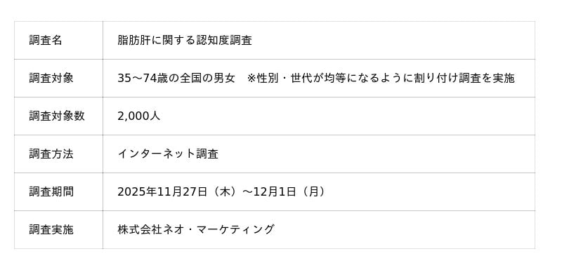 日本ベーリンガーインゲルハイム株式会社(本社:東京都品川区、代表取締役 医薬事業ユニット統括社長:荻村正孝、以下、日本ベーリンガーインゲルハイム)は、2月の全国生活習慣病予防月間に合わせ、全国の35~74歳までの男女2,000人を対象に、「脂肪肝に関する認知・理解度調査」を実施しました。