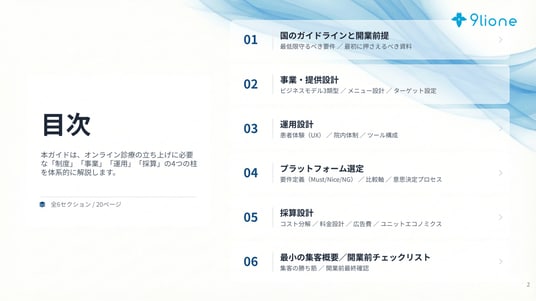 株式会社9lione(本社:東京都練馬区、代表取締役:廣田雄将)は、開業医・医療法人向けの無料資料「オンライン診療 新規開業スタートガイド」を公開しました。