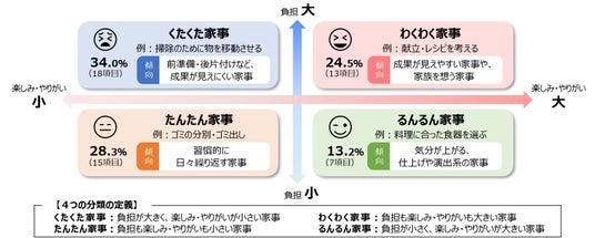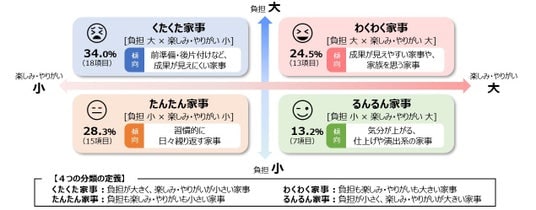 今回の調査では、全国の既婚男女1,101名を対象に、三大家事(「炊事」「洗濯」「掃除」)を、家庭全体の家事量において3割以上実施している人から回答を得て集計。「負担」と「楽しみ・やりがい」の大きさの観点から定義した4つの分類「くたくた家事」「わくわく家事」「たんたん家事」「るんるん家事」をあらかじめ設定し、家事53項目それぞれがどの分類に最も近いかを選択してもらいました。