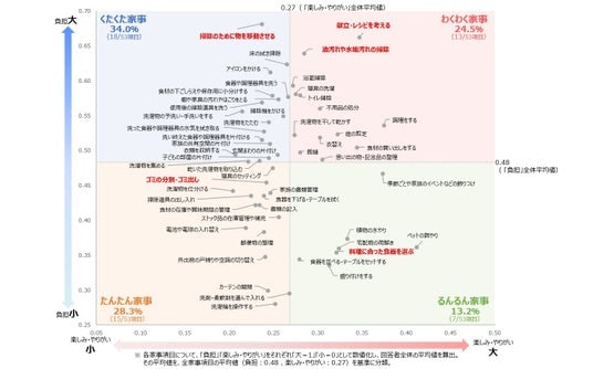 調査の結果、家事によって分類傾向に違いが見られ、負担が大きく、楽しみ・やりがいが小さい「くたくた家事」が34.0%で最も多いものの、負担も楽しみ・やりがいも大きい「わくわく家事」も24.5%存在しました。「くたくた家事」には、前準備や後片付けなどの成果が見えにくい家事、「わくわく家事」には、油汚れや水垢汚れの掃除や献立・レシピを考えるなどの成果が見えやすく、家族を想う気持ちや、ともに過ごす時間を大切にしたい意識から行われる家事が集まる傾向がみられました。