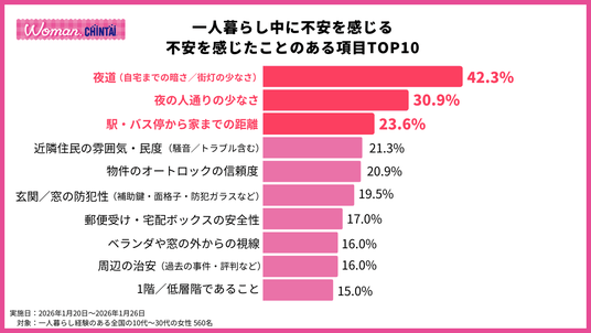 お部屋探しのリーディングカンパニー株式会社CHINTAI(本社:東京都港区 代表取締役社長 奥田倫也、以下CHINTAI)の運営する女性向け賃貸物件検索サイト『Woman.CHINTAI』は、一人暮らし経験のある10代~30代の女性を対象に、お部屋探しや日常生活における「防犯意識」に関するアンケート調査を実施いたしました。