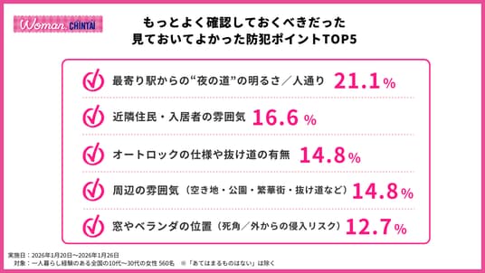 一人暮らしの際に「もっと確認すべきだった点」「見ておいてよかった」と思う防犯ポイントについて尋ねたところ、「最寄り駅からの“夜の道”の明るさ/人通り」(21.1%)が最も多く挙げられました。次いで「近隣住民・入居者の雰囲気」(16.6%)や「オートロックの仕様や抜け道の有無」(14.8%)などが続き、物件設備だけでなく周辺環境や建物の状況を事前に確認する重要性がうかがえます。
