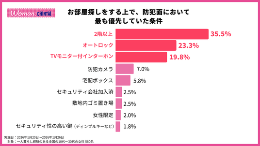 ・一人暮らし女性のうち、7割以上が部屋探しの段階で防犯を意識していることがわかりました。・防犯面で重視した条件では、「2階以上」が最多(35.5%)となりました。