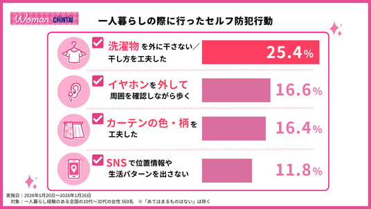 一人暮らしの際に行ったセルフ防犯行動について尋ねたところ、「洗濯物を外に干さない/干し方を工夫した」が(25.4%)が最も多く、次いで「イヤホンを外して周囲を確認しながら歩く」(16.6%)、「カーテンの色・柄を工夫した」(16.4%)が上位となりました。