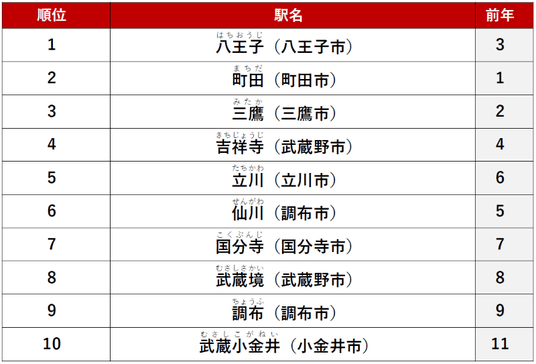 2位に「八王子」駅、3位に「三鷹」駅がランクインしました。