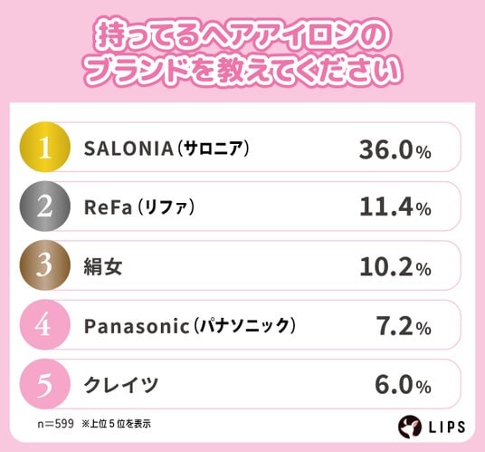 持っているヘアアイロンのブランドでは「SALONIA(サロニア)」が36.0%で最多となりました。背景には、手に取りやすい価格帯と十分な性能を両立し、初めての購入から買い替えまで幅広い層に選ばれやすい点があります。