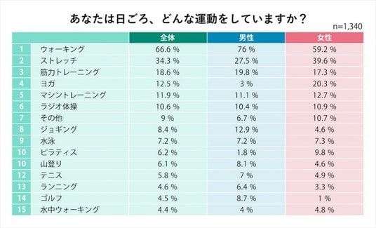 運動習慣がある人にどんな運動をしているかを尋ねると、1位は男女ともに「ウォーキング」66.6%でした。2位は「ストレッチ」34.3%、3位は「筋力トレーニング」18.6%でした。4位の「ヨガ」は12.5%で、特に女性が多くなりました。5位は「マシントレーニング」11.9%、6位は「ラジオ体操」10.6%が続きました。