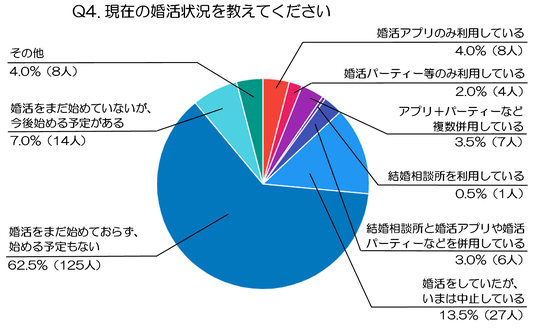 - 最も多かったのは、「婚活をまだ始めておらず、始める予定もない」で、62.5%(125人)でした。言い換えると、結婚や将来への関心はあっても、今は“具体的な一歩”をどう踏み出せばよいか決めきれていない層が多いことを示しています。こうした段階の方ほど、最初の不安を整理し、無理のない進め方を提示してくれる伴走者の存在が重要になります。