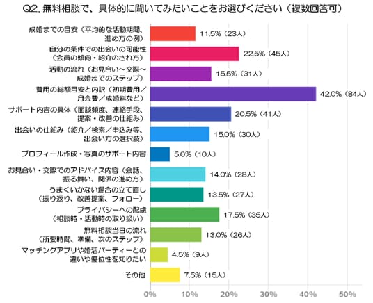 - 最も多かったのは、「費用の総額目安と内訳(初期費用/月会費/成婚料など)」で、42.0%(84人)でした。無料相談の場では、料金体系を大まかに知るだけでなく、実際に活動した場合の現実的な金額感を把握したいと考える人が多いことがわかります。