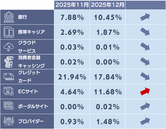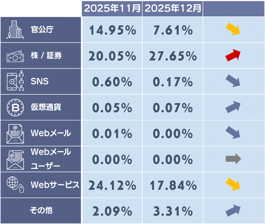 12月度は証券系、EC系のフィッシングサイトの構成比が上昇しています。Amazonやマネックス証券のフィッシングサイトが増加したことが起因しています。