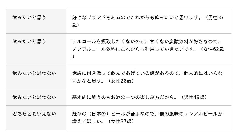 ノンアルコールビールの飲用状況や意識、自由回答にて飲用意向理由について聞いています。調査結果をお知らせいたします。