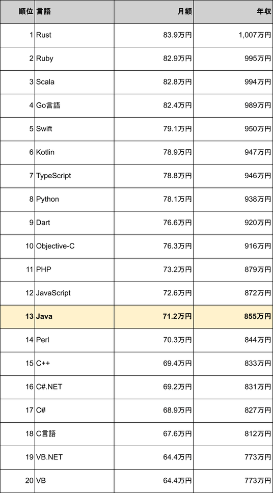 Java案件の平均月額単価は71.2万円、平均年収は855万円で、プログラミング言語別の年収ランキングでは13位に位置しています。