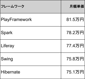 2026年2月時点のJavaフレームワーク別の月額単価は、1位がPlay Frameworkで81.5万円、2位がSparkで78.2万円、3位がLiferayで77.4万円、4位がSwingで75.8万円、5位がHibernateで75.1万円です。