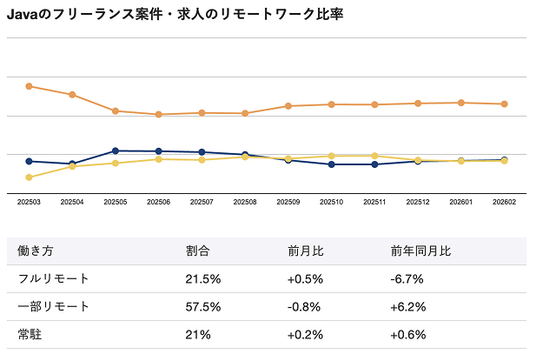 2026年2月時点のJava向けフリーランス案件・求人におけるリモートワーク比率は、フルリモートが21.5%、一部リモートが57.5%、常駐が21%となっています。